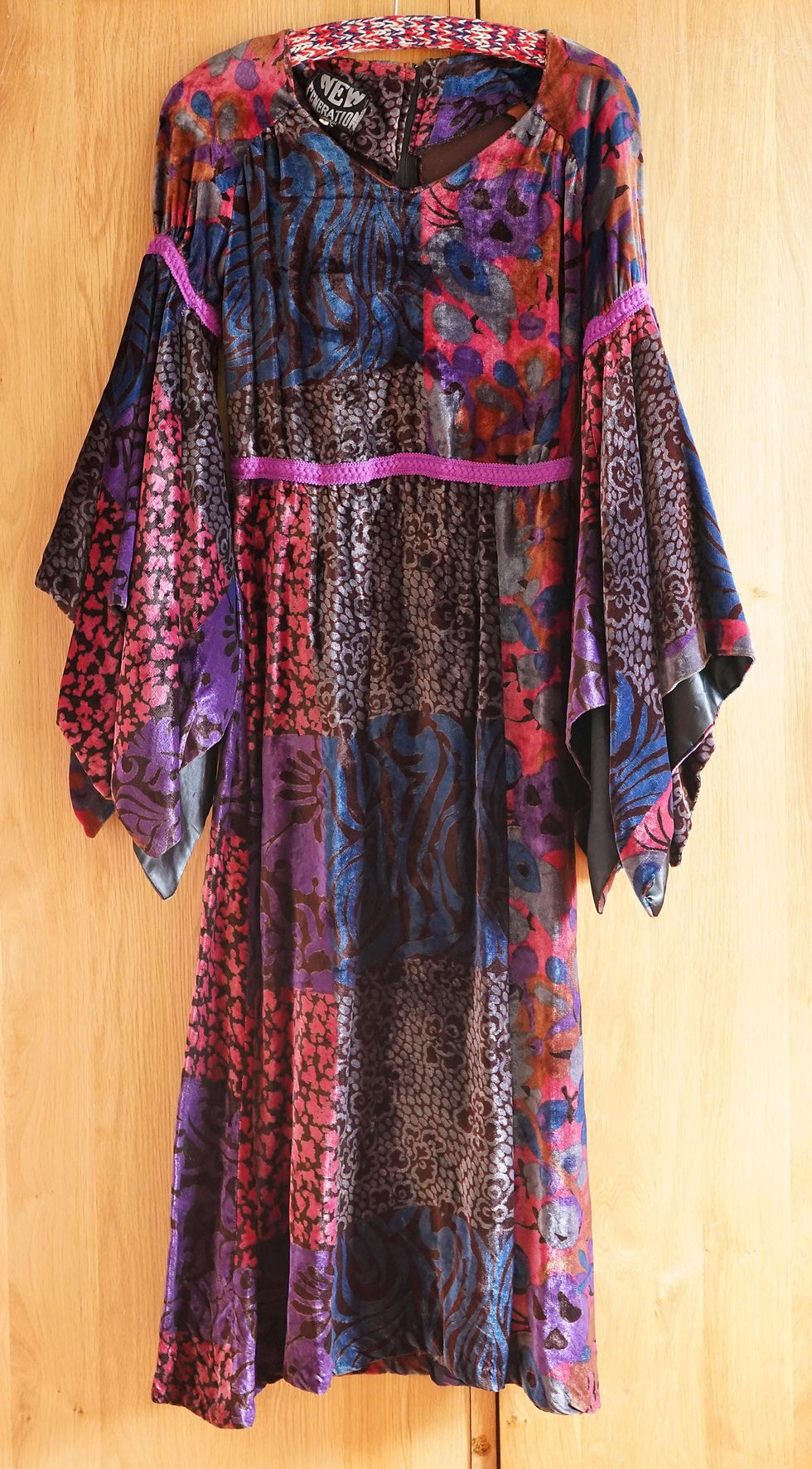 1970s Velvet Patchwork Print Boho Hippie Witch Witchy Handkerchief Sleeve Dress